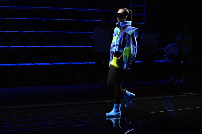 整個秀場,靚麗前衛(wèi)的膠靴或踏于足下,或成為時尚新品挎于體側(cè),伴著強(qiáng)勁的樂曲,綻放出化工科技在時尚前沿的另類美學(xué)。